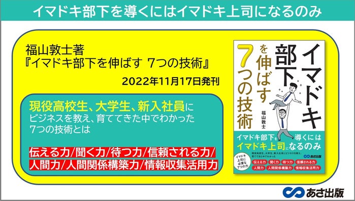 ギグセールス株式会社(東京都渋谷区)代表取締役の福山敦士(ふくやまあつし)の15冊目となる著書『イマドキ部下を伸ばす7つの技術』が、株式会社あさ出版より出版された。