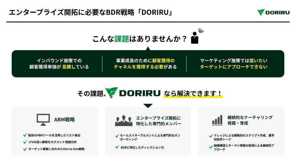 当社は、2017年の設立から一貫してBtoBの新規開拓であるアウトバウンド・BDRに強みを絞って事業を展開してきました。2020年より未接点且つ中堅から大手企業の新規商談創出を実現するSaaSマーケティング支援サービス「DORIRU」をリリースし、これまで300を超える企業様を支援してきました。今後更なる支援と領域拡大を目指すべく、この度展示会に出展することを決定いたしました。